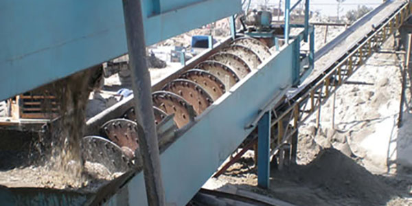 該設(shè)備廣泛用于各種易洗和難洗礦石的洗礦。礦石中含泥在20%以上則對(duì)碎礦機(jī)及溜槽產(chǎn)生堵塞,該設(shè)備可使含泥在20%以上的礦石,在洗石機(jī)中螺旋攪拌、擦洗達(dá)到礦石與泥分離的目的,洗凈后的礦石從排料口排出,泥水從尾礦端排出。該設(shè)備與圓筒洗礦機(jī)配合,對(duì)處理難洗礦石是目前比較有效的設(shè)備。
