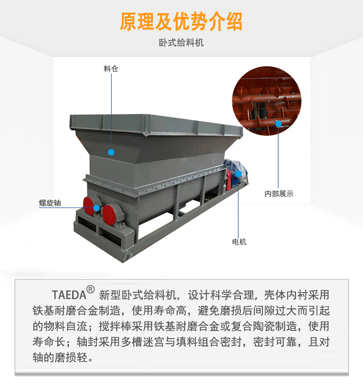 臥式給料機是一種新型高效給料設備,按照原料特性,分為滑架式破拱給料機(適用于高粘度物料的攪拌打散給料),圓盤給料機(適用于顆粒類流動性好的原料),多軸均勻給料機(適用于生物質(zhì)原料),雙軸打散給料機(適用于煤泥類原料),膠帶箱式給料機(適合于通用性原料)。泰達會根據(jù)不同物料配置適合的臥式給料機,實現(xiàn)連續(xù)的或不間斷的供料輸送,并且具有較大的暫存緩沖作用,儲料量一般在10m3以上。全系列臥式給料機都采用耐磨特性材料,具有結(jié)構(gòu)合理,堅固耐用,運轉(zhuǎn)平穩(wěn)等特點,廣泛用于工礦企業(yè),是比較理想的連續(xù)給料輸送設備。
