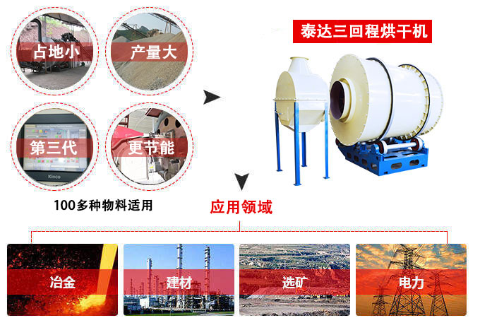 物料在烘干機(jī)內(nèi)走動(dòng)三個(gè)回程,水分蒸發(fā)徹底,烘干成品均勻且質(zhì)量高,因?yàn)槿爻探Y(jié)構(gòu),因此占地面積是長(zhǎng)滾筒烘干機(jī)的1/3